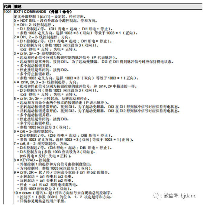 變頻器調(diào)試過程中,必須確保參數(shù)設(shè)置和端子接線的對應(yīng)。下面是ACS510啟動(dòng)/停止/方向參數(shù)的設(shè)置選項(xiàng),任何一個(gè)選項(xiàng)都可以實(shí)現(xiàn)對變頻器外部控制1的運(yùn)行/停止/方向控制。