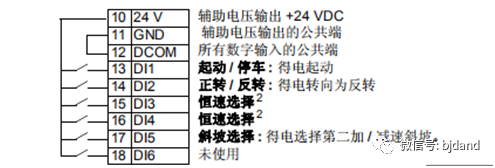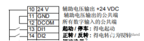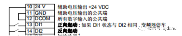 舉例3:如果變頻器的啟動(dòng)/停止/方向控制信號接到13號(DI1)和14號(DI2),其中DI1作為正向啟動(dòng),DI2作為反向啟動(dòng).當(dāng)DI1置高電平后,變頻器啟動(dòng)運(yùn)行一個(gè)方向。DI1置低電平后變頻器停止。當(dāng)DI2置高電平后,變頻器運(yùn)行另一個(gè)方向。DI2置低電平后變頻器停止。