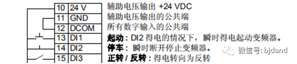 舉例2:如果變頻器的啟動(dòng)/停止/方向控制信號接到13號(DI1)和14號(DI2)及15號(DI3),其中DI2接常閉按鈕作為停止,DI1接常開按鈕作為啟動(dòng),DI3接開關(guān)。當(dāng)DI1收到脈沖后,變頻器啟動(dòng)運(yùn)行一個(gè)方向。DI3置高電平時(shí),變頻器運(yùn)行另外一個(gè)方向。當(dāng)DI2(常閉)打開時(shí),變頻器停止運(yùn)行。