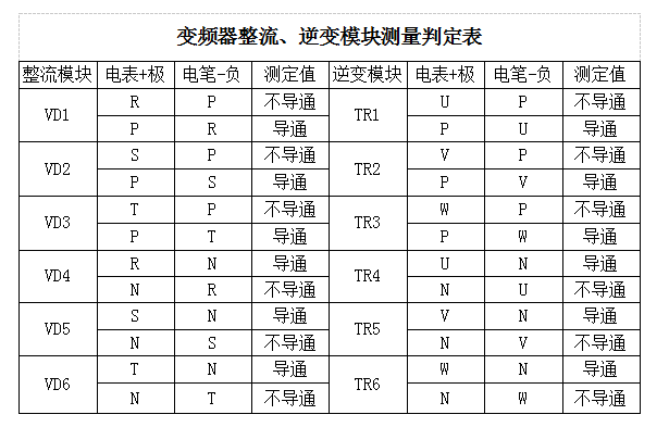 根據二極管和IGBT的單項導通性,將一支表筆搭接在直流母線正極P上,另一支表筆分別搭接在電源R、S、T上看導通情況,如果全通或者全不通則將表筆反過來測量應全不通或者全通,此種情況說明整流模塊上半橋二極管完好。如果出現有的通有的不同時整流模塊損壞。同樣對于直流母線負極N和P極的測量方判定方法一樣。對于逆變模塊的測量和整流模塊一樣,只不過是將表筆搭接在輸出端子U、V、W上看通斷來判斷。
