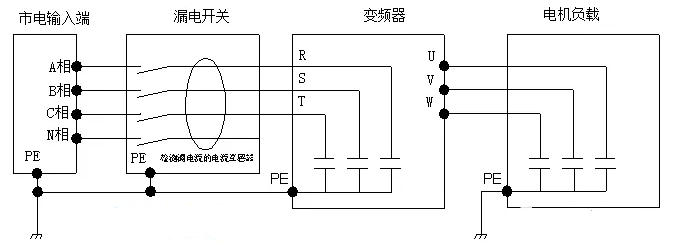 變頻器輸出側為PWM波,電機電纜與大地之間有長電纜的電容效應,使用帶屏蔽層的電纜時,電容效應更加明顯。在變頻器工作時,電容在充放電,有電流通過電容流入大地,并從進線側的接地線再流回變頻器,形成電流回路。如果在進線側使用了漏電保護器,那么它會動作,切斷系統運行。